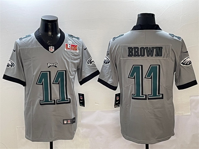 Men Philadelphia Eagles 11 A J Brown Grey 2025 Super Bowl LIX Patch Vapor Untouchable Limited Stitched Football Jersey