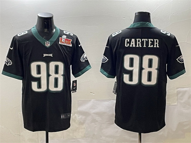 Men Philadelphia Eagles 98 Jalen Carter Black 2025 Super Bowl LIX Patch Vapor Untouchable Limited Stitched Football Jersey
